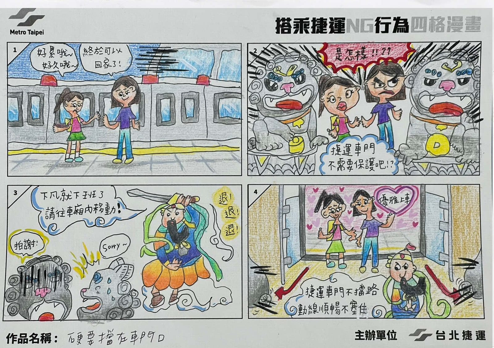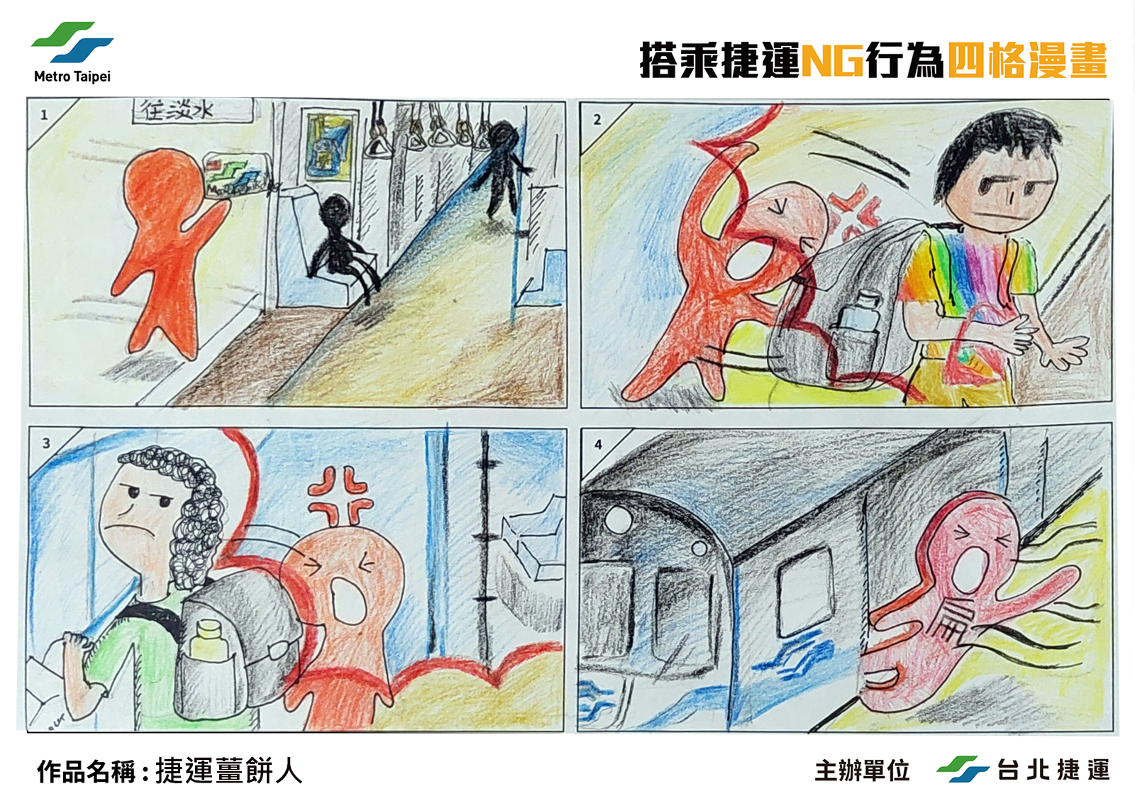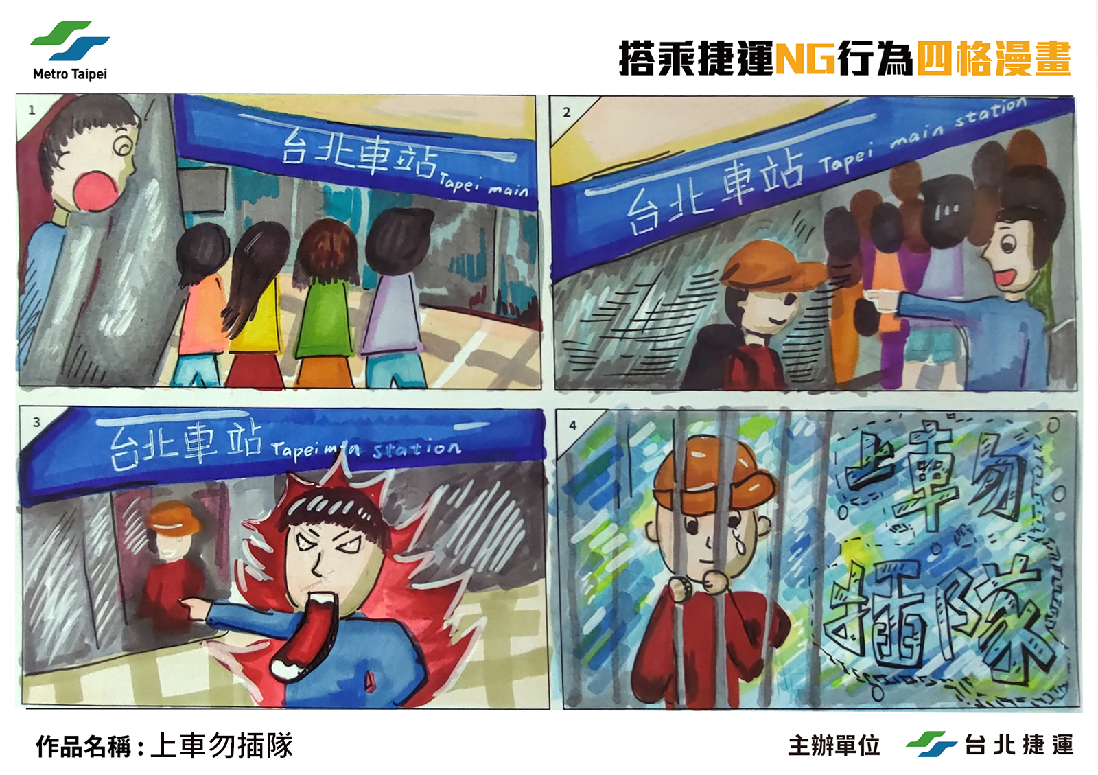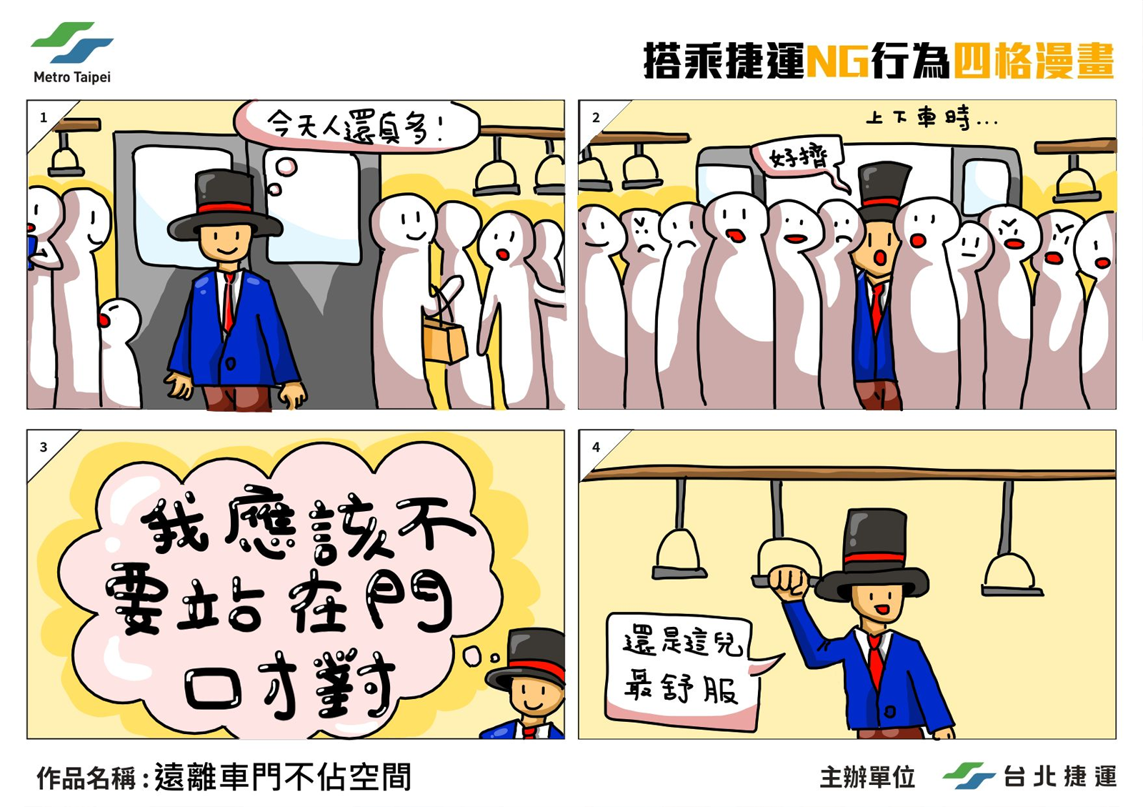 - 這幅四格漫畫是要提醒大家搭捷運時,要遠離車門,不要擋住上下車的空間...
