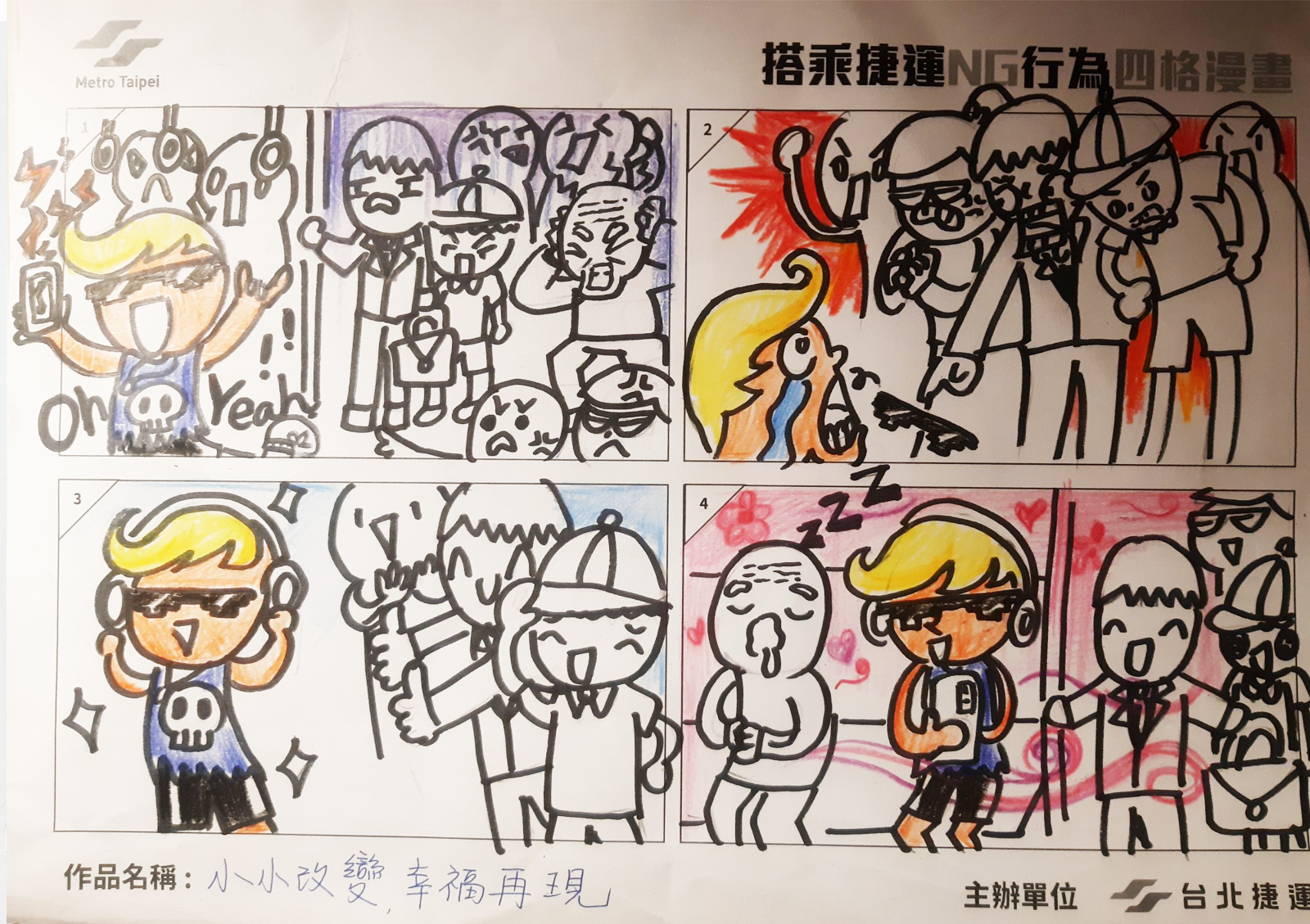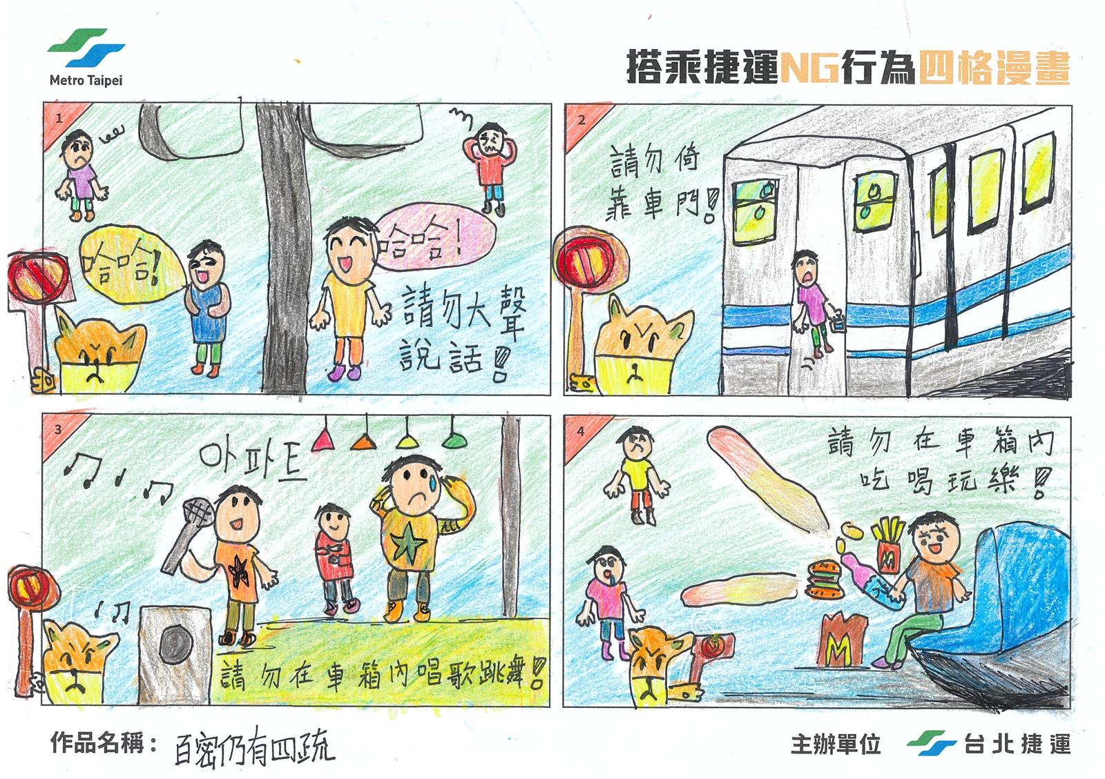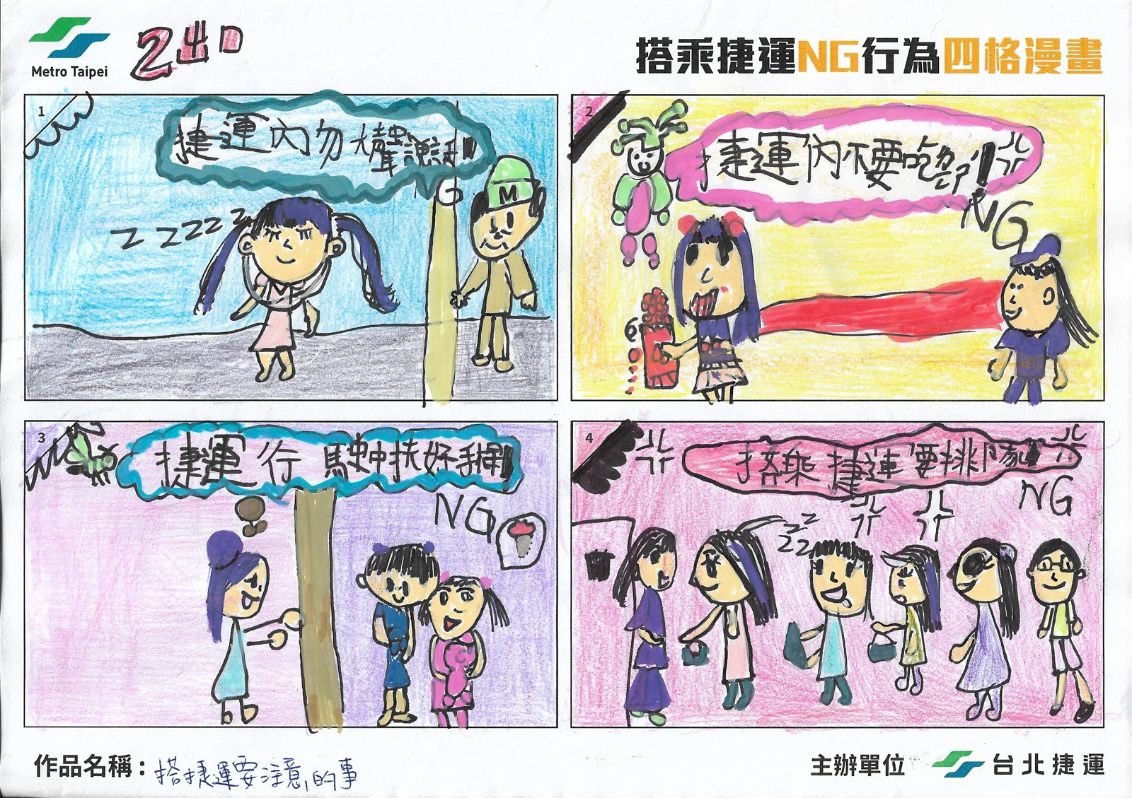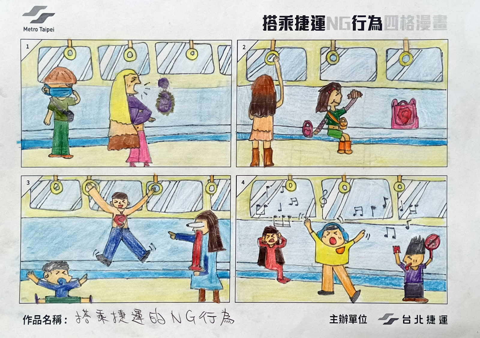 - 這幅四格漫畫是要提醒大家搭捷運時,要遠離車門,不要擋住上下車的空間...