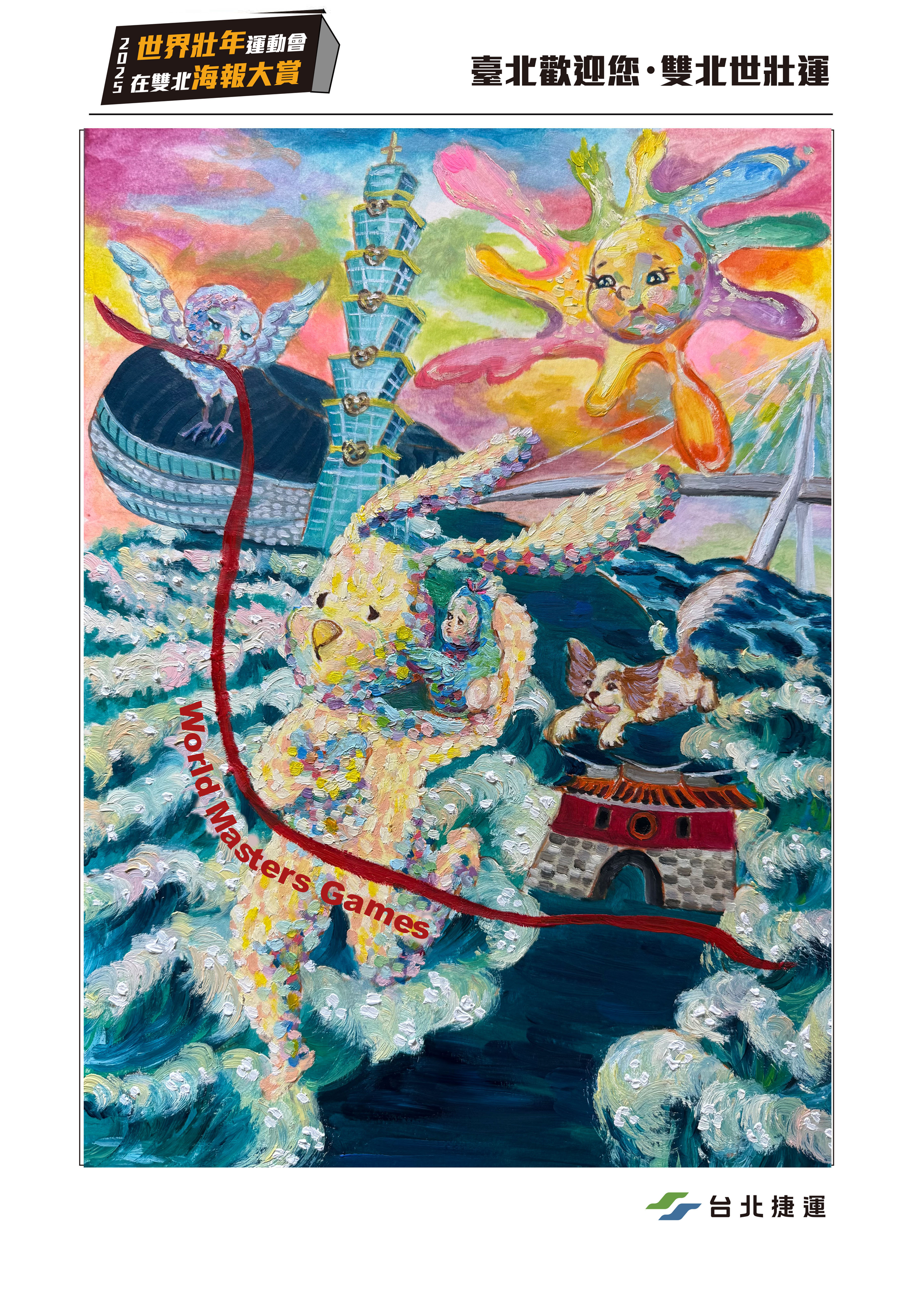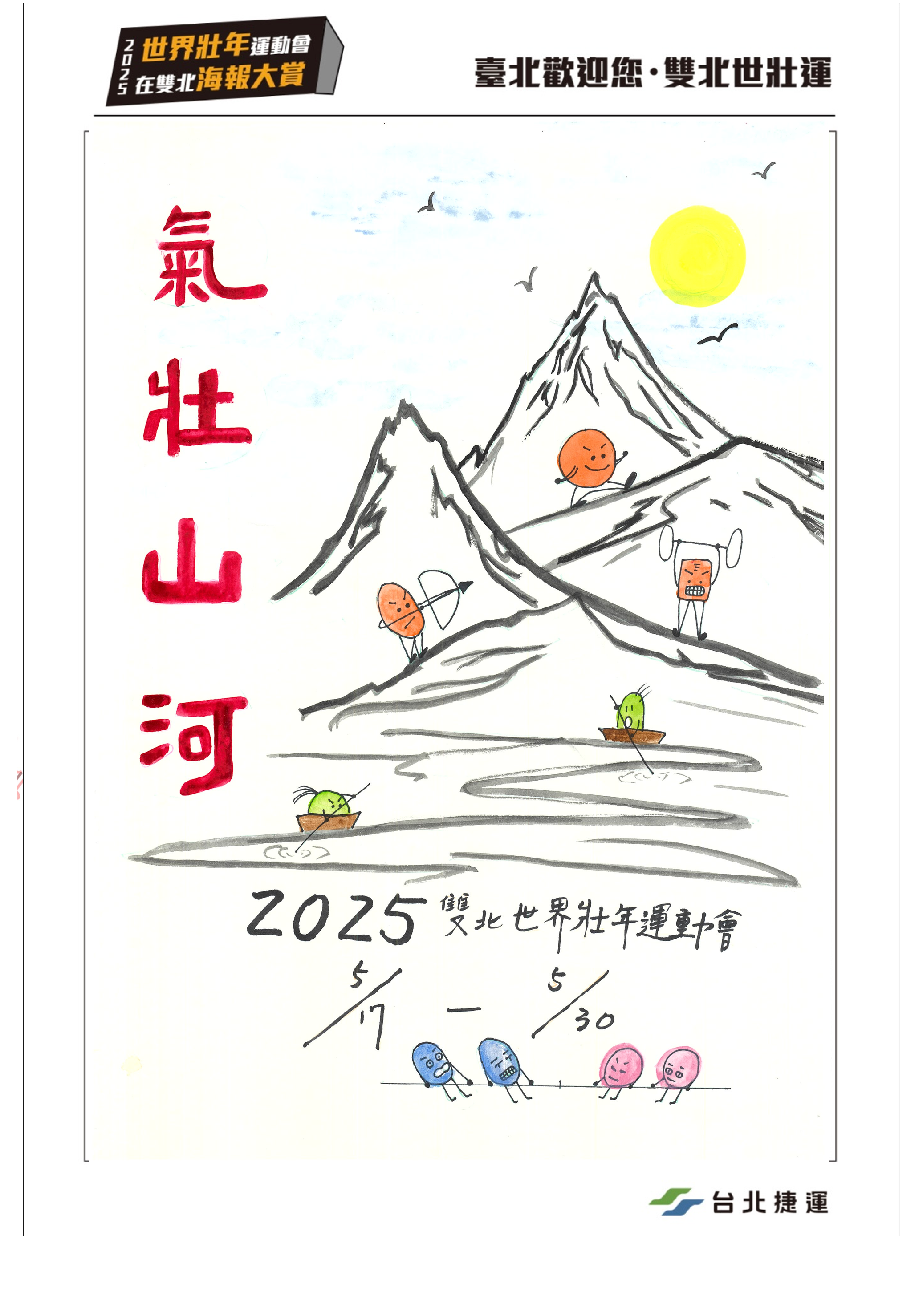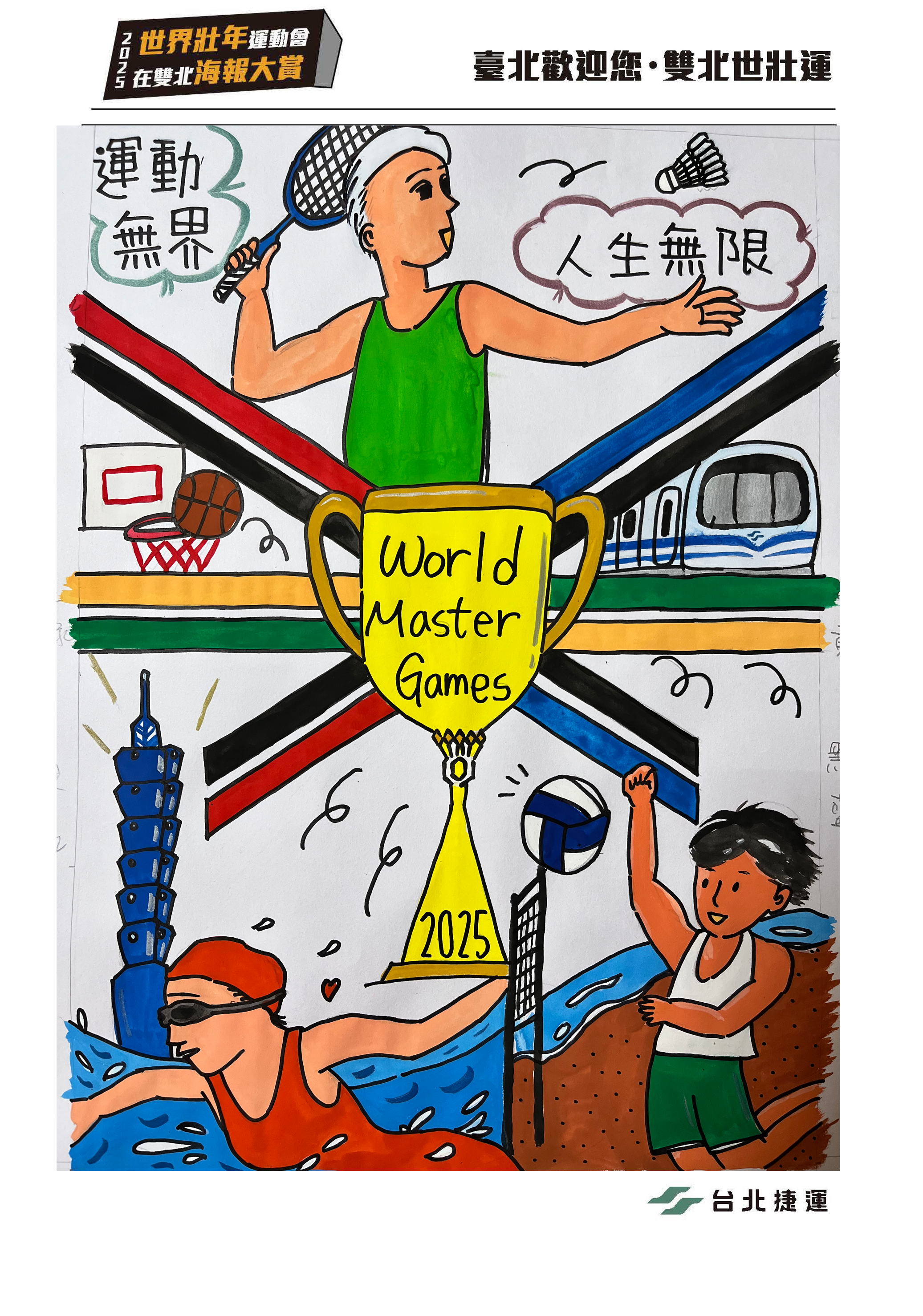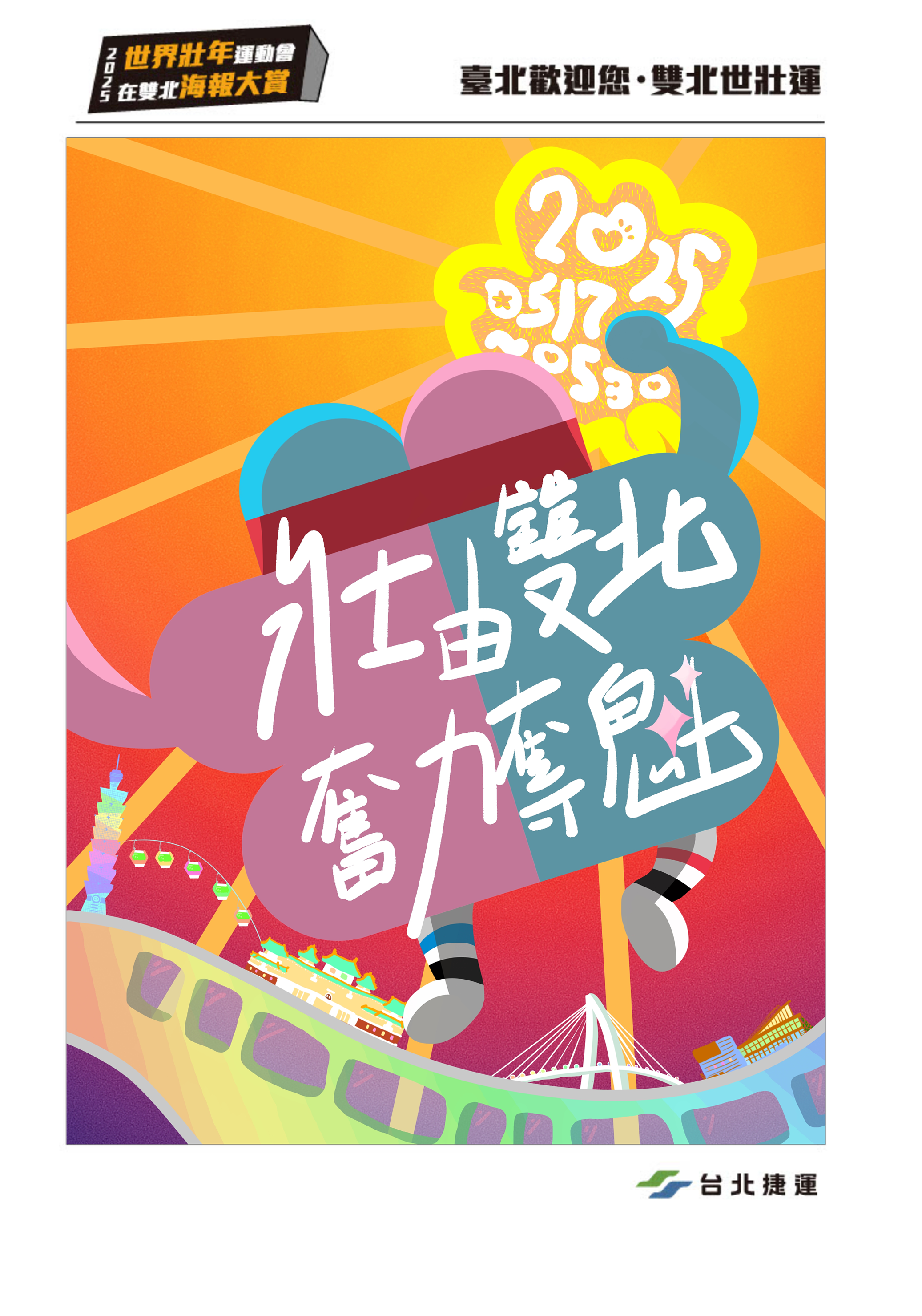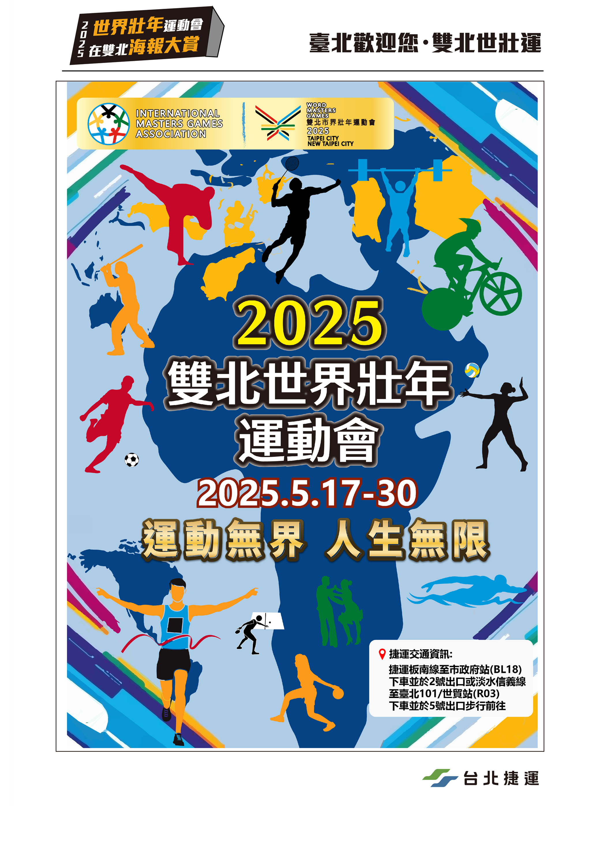 - 海報設計理念融合世界壯年運動會LOGO的五種顏色,象徵世界壯年運動員力量與活力...